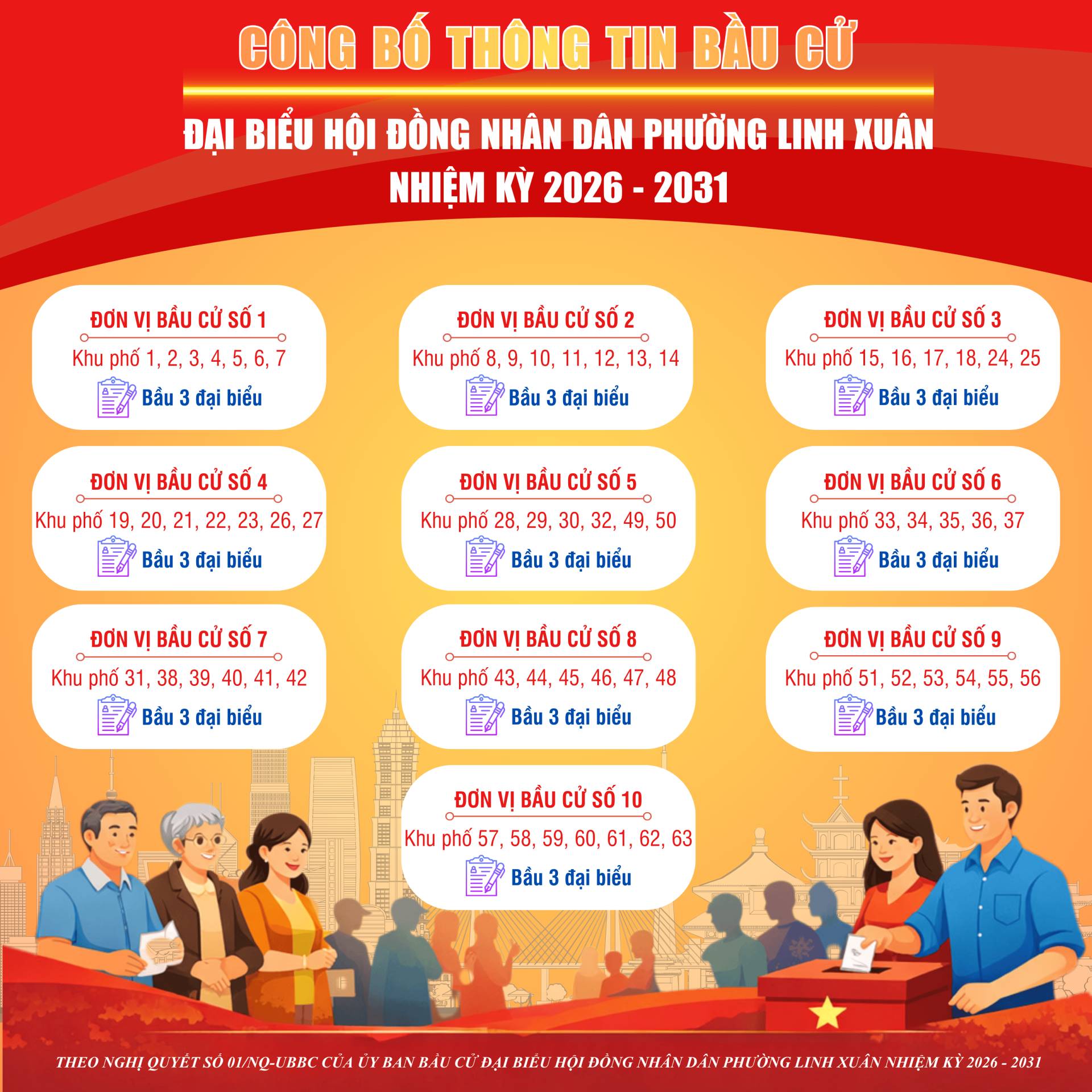 Nghị quyết số 01/NQ-UBBC về công bố số đơn vị bầu cử, danh sách các đơn vị bầu cử và số đại biểu được bầu ở mỗi đơn vị bầu cử đại biểu Hội đồng nhân dân phường Linh Xuân, nhiệm kỳ 2026 - 2031