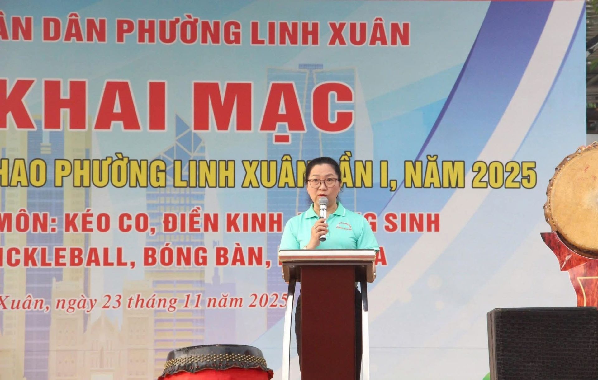 Phát biểu khai mạc Đại hội, đồng chí Nguyễn Thị Kim Cúc, Chủ tịch UBND phường nhấn mạnh vai trò, ý nghĩa to lớn của hoạt động luyện tập thể dục thể thao đối với sức khỏe và sự phát triển bền vững của cộng đồng. Đồng chí trích dẫn lời dạy của Chủ tịch Hồ Chí Minh: “Mỗi người dân khỏe mạnh tức là cả nước khỏe mạnh”, qua đó khẳng định sức khỏe là nền tảng của năng suất lao động, trí tuệ và chất lượng cuộc sống. Tại phường Linh Xuân, phong trào thể dục thể thao những năm qua đã lan tỏa mạnh mẽ, thể hiện qua sự ra đời của nhiều câu lạc bộ, sự đầu tư cơ sở vật chất và tinh thần luyện tập thường xuyên của cán bộ, người dân ở mọi lứa tuổi.