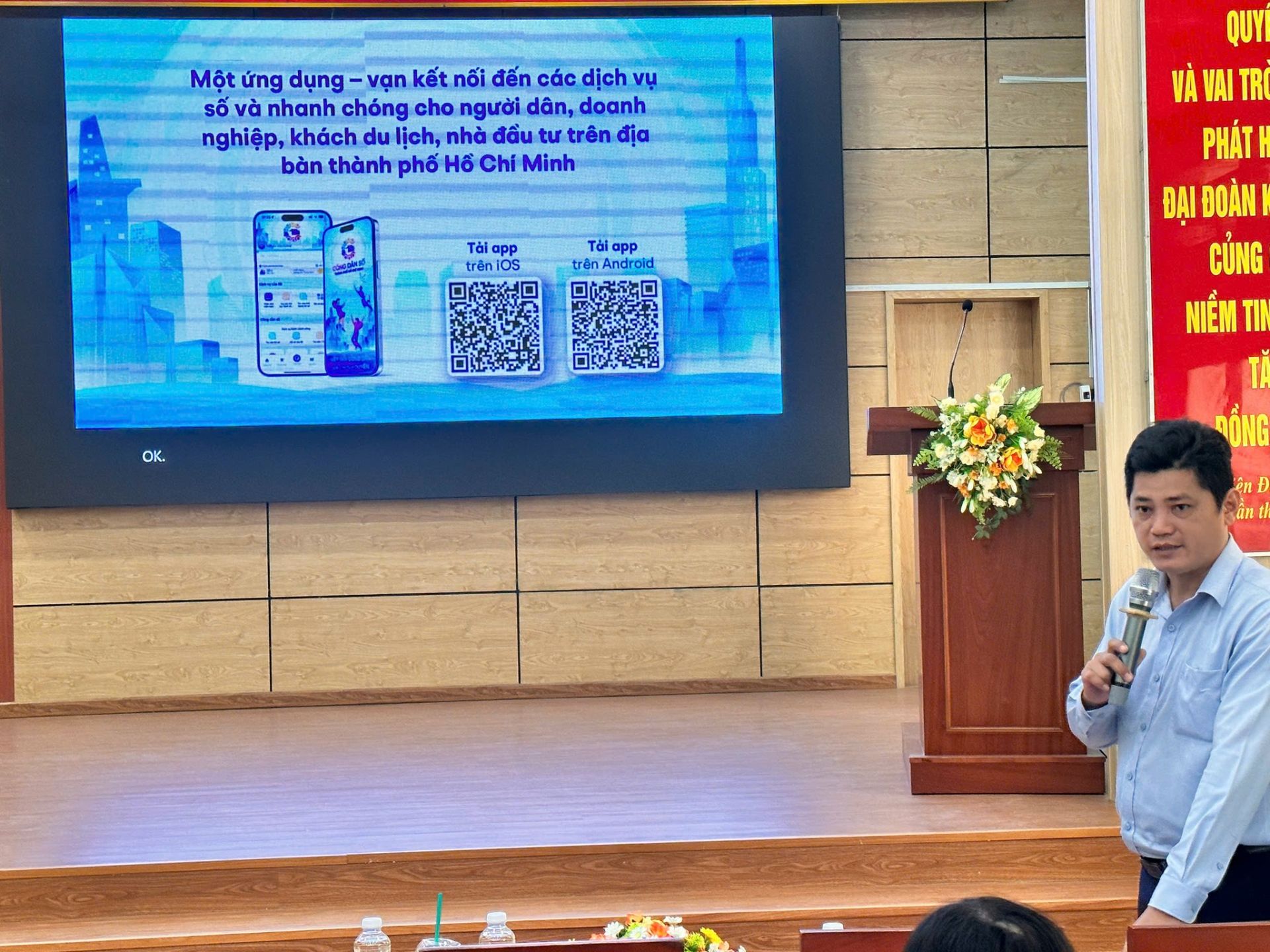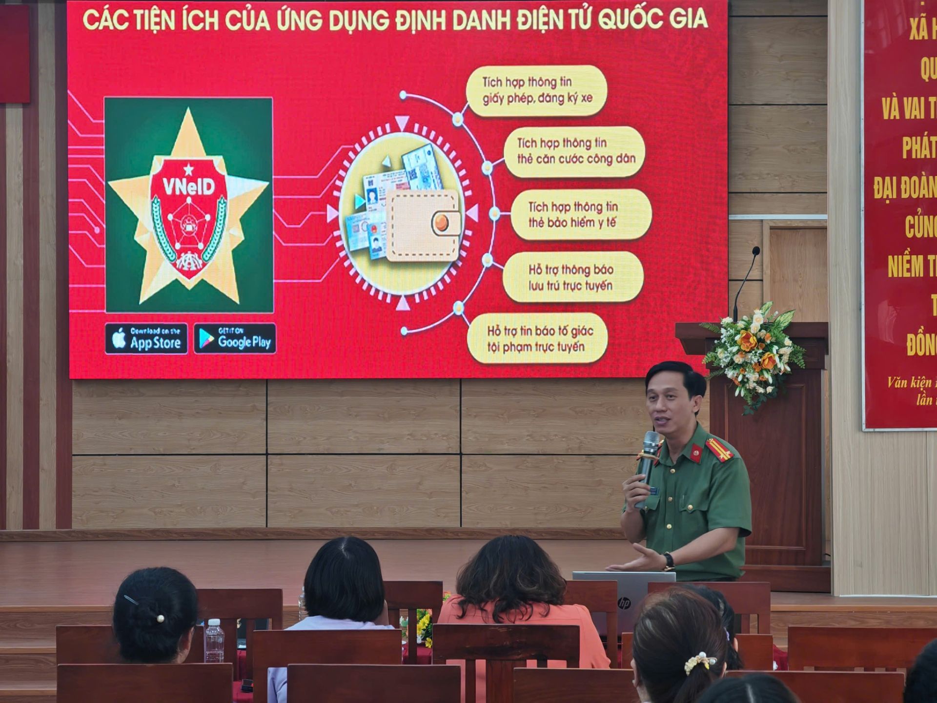 Các đại biểu tham dự chương trình được tập huấn, hướng dẫn cài đặt và sử dụng ứng dụng Công dân số Thành phố Hồ Chí Minh, ứng dụng VneID, ứng dụng SOS An ninh trật tự do Báo cáo viên Trung tâm Chuyển đổi số Thành phố Hồ Chí Minh và Báo cáo viên Công an Thành phố Hồ Chí Minh hướng dẫn.